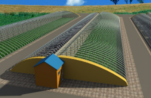 墻體采用土墻結構,支撐柱采用溫室建造專用梯形砼柱,棚面采用琴弦式骨架結構,用熱鍍鋅鋼管作為主骨架,骨架間敷設竹竿與托膜鍍鋅鋼絲,棚面覆蓋透光性好、抗老化的保溫膜。